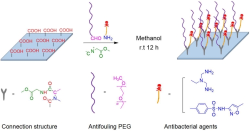 面对日益严峻的水资源紧缺现状,反渗透(RO)已成为主流的水处理技术。然而,膜污染一直是影响反渗透技术进一步发展以及制约其运营成本的一大障碍。针对上述问题,孟建强教授课题组尝试通过多组分反应在RO膜表面进行多功能修饰,一步反应同时将抗污染成分和抗菌成分引入膜表面,有效抑制有机污染、无机盐污染和生物污染,制备抗菌抗污染的反渗透膜。他们以商品化的芳香聚酰胺族(PA)RO复合膜为研究对象,利用其表面含有大量羧基这一结构特点,在其表面进行Ugi-4CR(乌吉四组分反应):以RO膜作为羧基组分;亲水性大分子醛基化聚乙二醇单甲醚(CHO-MPEG)作为醛基组分;带有端氨基的抗菌剂三(2-氨乙基)胺(TAEA)或磺胺甲恶唑(SMZ)作为氨基组分;廉价的异氰基乙酸甲酯作为异氰组分。在室温条件下,以甲醇为溶剂,将等物质的量的其他三组分与RO膜反应,一步反应同时在膜表面接枝亲水性分子和抗菌剂,可以有效抑制水中的有机物、无机盐以及微生物污染。