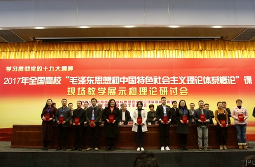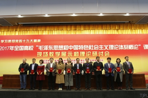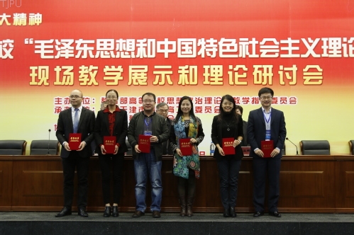 随后,进入现场教学展示环节。这一环节,大会择优遴选了18位教师分别在两个会场进行现场教学展示,教育部高等学校思想政治理论课教学指导委员“毛泽东思想和中国特色社会主义理论体系概论”分教学指导委员会委员参加现场教学展示观摩活动,并进行精彩的点评,评出“毛泽东思想和中国特色社会主义理论体系概论”课教学标兵6名、教学能手12名。我校杨永利老师获得本次比赛的最高荣誉奖(教学标兵)。教育部高等学校思想政治理论课教学指导会委员为现场教学展示获奖的优秀教师颁奖。