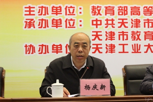 中共天津市教育工作委员会副书记、天津市教育委员会副主任杨清海致辞,他指出,天津市为了提高思想政治理论课质量,提供了资金、编制、政策等支持,通过天津市重点马克思主义学院建设、名师工作室设立、天津市高校思想政治理论课宣讲团组建、天津市大学生思想政治课公开课大赛等举措,使高校思想政治理论课教师成为羡慕的教师。