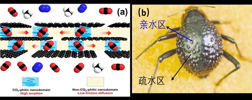研究团队在前期研究工作的基础上(Energy Environ. Sci., 2016, 9, 3107-3112IF=29.51),采用了新的仿生设计思路,实现了高效传递通道的构建。小分子在膜内的快速传递需要吸附与扩散的平衡,沙漠甲虫(Stenocara beetle)背部特有的亲疏相间微区结构,可实现在干旱沙漠地区快速捕集与传递水分,为吸附扩散结构的设计提供了灵感。研究团队模仿沙漠甲虫背部结构,在氧化石墨烯的片层空间内,设计了具有亲疏相间微区的高效CO2传递通道。研究工作通过在氧化石墨烯特定位点插层小分子聚氧乙烯,并通过真空辅助抽滤制备了超薄分离层的复合膜。聚氧乙烯分子及周围区域作为亲CO2微区,可实现CO2的高效吸附;未氧化的石墨部分为非亲CO2微区,由于具有原子级的光滑,可实现CO2的快速扩散,从而实现了吸附-扩散机制的协同。同时聚氧乙烯分子可实现对片层间隙的调控。该膜CO2渗透通量为175.5 GPUCO2/CH4选择性为69.5,是目前干态测试下文献报道的最高值,实现了氧化石墨烯膜在干态下的成功应用。