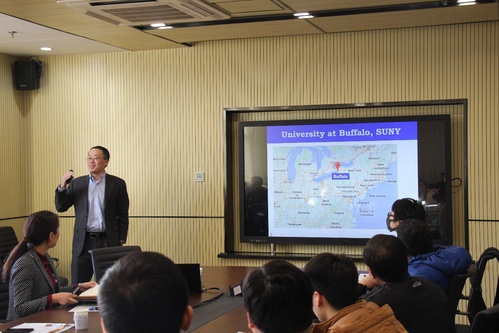 报告会上,林海青博士首先对纽约州立大学-布法罗大学基本情况及往届的优秀毕业生等做了简要介绍。然后详细讲述其在分离膜材料对于解决大气变暖、水资源污染等领域重要作用背景下的研究工作。林博士研究小组发现在聚苯并咪唑(PBI)高分子膜中引入磷酸交联,利用磷酸分子增大PBI分子链间距,从而达到对H2高选择性和高通量的效果。他们还发现在膜内混入钯纳米颗粒,通过调控共混及成膜条件,制备均匀气体分离膜。利用钯纳米颗粒与H2间较强的相互作用,通过促进传递 提高了H2的渗透通量和选择性。随后,林海青博士介绍了其在超滤膜抗污染改性方面研究。特别是通过在膜表面接枝聚多巴胺及光敏材料偶氮二苯,利用聚多巴胺中多氨基提高膜亲水性,利用偶氮二苯在紫外和可见光转换时偶氮二苯的构型变化提高膜的自清洁性能,为膜的防污性能改善问题提供了新的思路。会后,林海青博士与在场师生就气体分离膜的结构设计与调控、工业化应用以及水处理聚合物膜污染控制等相关问题进行深入研讨,并结合自身求学和企业工作的经历与大家分享了有关科研经验,现场学术氛围浓厚。学术报告会后,林教授就科研合作、研究生培养以及引智基地建设等与膜实验室专家进行了深入交流与讨论。