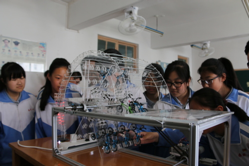 启动仪式结束后,“拥抱智能新时代 青春接力共成长”智能科普课堂开始。我校机械工程学院师生给中学生们带来了学校机器人创新实验室和全国机器人大赛获奖作品展示。智能自主飞行无人机系统,仿生爬坡机器人,拳击、舞蹈、竞速机器人,智能垃圾桶、旋转式自行车停放装置、立体停车车库一一闪亮登场,赢得现场中学生的阵阵喝彩声。学生们还现场向中学生介绍机器人基础知识、结构原理和实际应用,并操控机器人进行各种动作展示,通过直观的现场演示和深入浅出的讲解,激发中学生对科技知识的学习兴趣,提高中学生扎实掌握数理化基础知识的积极性和主动性。