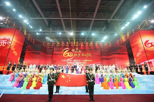 现场一段气势磅礴的宣传片,追溯了学校历史。开场歌舞《织梦新时代》令人倍感振奋,抒情的情景配乐诗朗诵《九月,我们为您祝福》讲述了天工人60载不懈奋斗、一甲子薪火相传的辉煌史诗,让大家湿了眼眶。