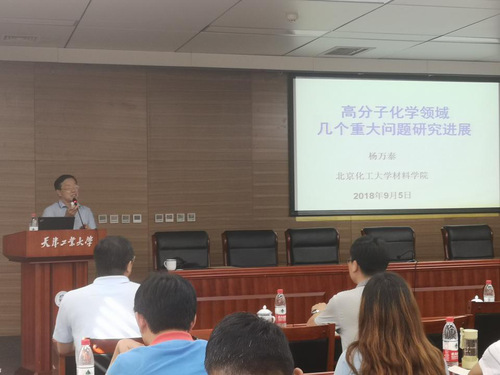2018年9月5日,应我校分离膜与膜过程国家重点实验室和材料科学与工程学院邀请,中国科学院院士、高分子化学家、北京化工大学教授杨万泰院士来我校作学术报告。杨院士报告主题为“传统/主流高分子化学领域中几个重大难题研究”。