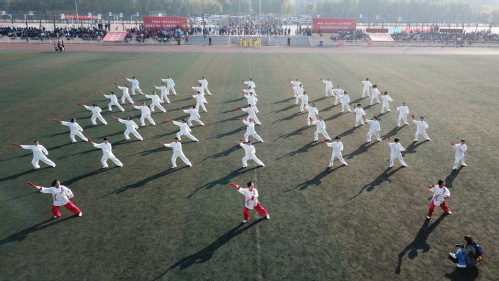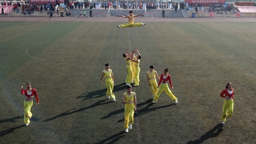 开幕式表演中,伴随着一声“时刻准备着”,男子应急棍术表演者进入场内。他们以熟练的棍法向观众们展现了力的纯粹。在《中国功夫》铿锵有力的乐曲声中,太极扇表演者们一招一式,一动一静,有条不紊。健美操表演在动感中让人焕发青春的朝气,将运动和美完美结合。