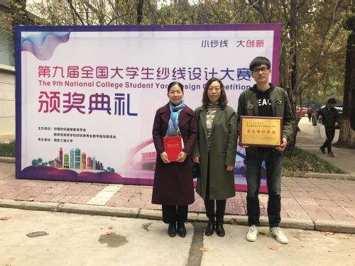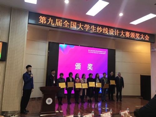 2018年11月17日第九届全国大学生纱线设计大赛颁奖大会在西安工程大学隆重举行。经过激烈角逐,我校获得一等奖4项、二等奖4项、三等奖8项。同时,我校获得“最佳组织单位奖”,赵立环、周宝明位老师获得“优秀指导教师奖”。我校学生徐沈阳作为4名参赛学生代表之一,参加了颁奖礼并作报告,分享了作品创作过程和参赛感受。