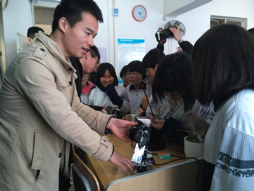 2017年12月,校学工部组织“青马工程”学员来到尤古庄初级中学,学校“青马学子领读团”学员们结合自身成长实际和身边感受到的发展成就,宣讲了党的十九大精神,讲解了习近平新时代中国特色社会主义思想原理,将高屋建瓴的政策理论落细落实,实现贴近学生、贴近实际,为中学生们播下树立进取志向、共建美好国家的思想种子。在“机器人知识”讲座中,当两个小机器人放到桌子上的时候,小同学们一下子就被这两个古怪精灵的机器人吸引住了。这个机器人在程序控制下,既可以自主前进,还可以随着音乐节拍翩翩起舞。通过现场演示和讲解,激发了中学生对科技新知识的学习兴趣。在“职业生涯规划”讲座中,朱旭光老师轻松幽默、循循善诱的讲课风格让同学们非常喜欢,从而启发中学生们全面认识自我优势,为实现职业发展目标打牢知识基础。