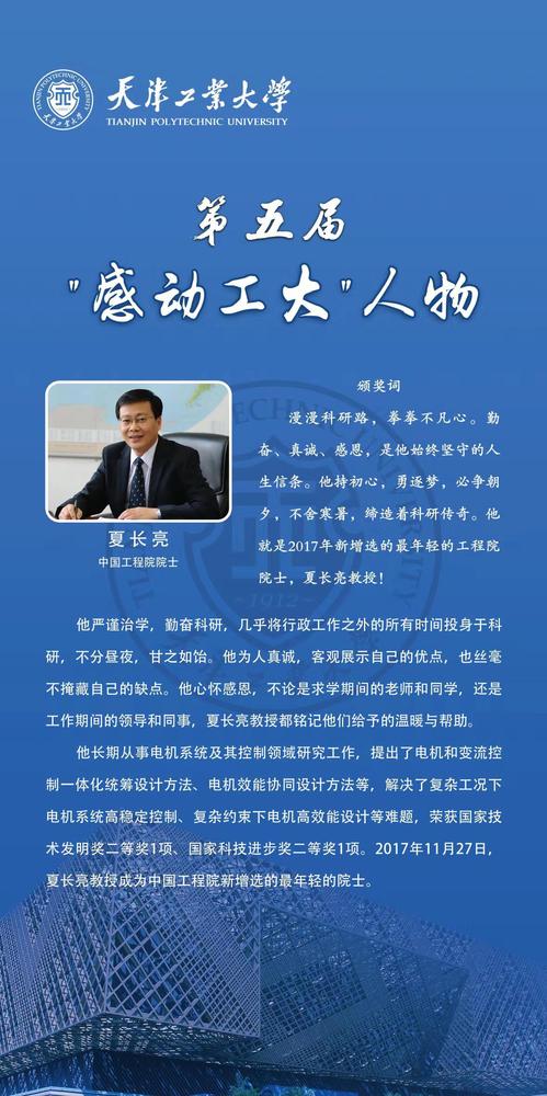 据悉,2018年1月,我校启动第五届“感动工大”人物评选活动,经过动员推荐、网络投票、会议评审、学校党委审定批准等流程,夏长亮、肖长发、荆涛、魏佳彬、门云阁、盛梅、魏浩波、申屠献忠、宋大龙、姬洪波、刘伯福、周自航12位教师、校友和学生荣获得“虎牙平台第五届‘感动工大’人物”荣誉称号。2018年9月7日,学校举办了第五届“感动工大”人物颁奖典礼。他们的故事使全体天工人经历了一次心灵的洗礼,一次精神的升华。