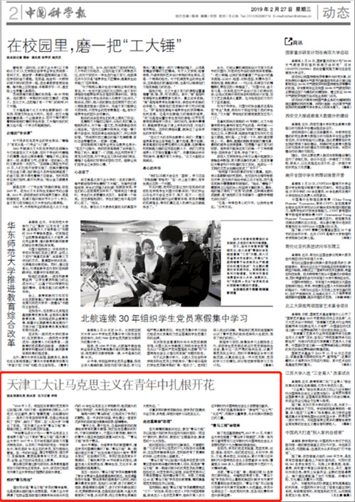 2019年02月27日,《中国科学报》第二版以《天津工大让马克思主义在青年中扎根开花》为题对我校做了报道,现将全文转发如下,以飨读者。