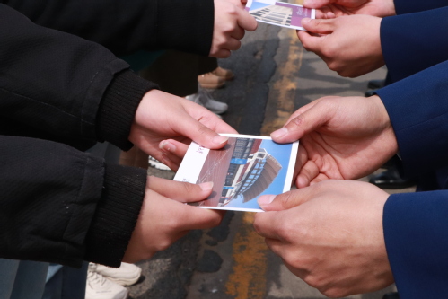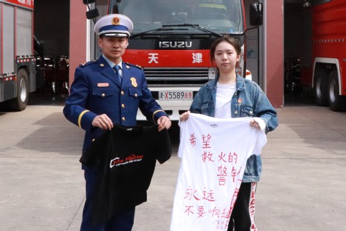 主题团会结束后,双方青年在人文学院英语1802团支书林聪伟的带领下重温入团誓词,并在“激扬爱国志,奉献新时代”的横幅上庄严签下了自己的名字。人文学院学生代表向物华道消防队消防员赠送了印有工大校徽和写有“希望救火的警铃永远不要响起”字样的T恤衫,以及写有同学们对消防队员祝福话语的明信片。