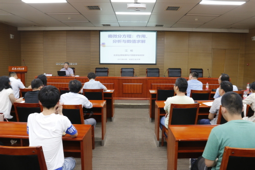 随后,江松院士在会议中心第七会议室作了题为“偏微分方程:作用、分析与数值求解”的学术报告。报告中,江松院士介绍了科学与工程技术、经济与国防建设等领域中提出的许多偏微分方程数学模型,这些模型的理论分析与数值求解对推动相关领域的发展具有十分重要的作用。报告结合具体实例,生动介绍偏微分方程在科学与工程等领域中的作用,它的数学理论与数值求解研究的热点问题、面临的挑战与可能的解决途径。整场报告内容丰富、深入浅出,赢得了广大师生的阵阵掌声,讲座在和与会师生的互动交流中圆满结束。