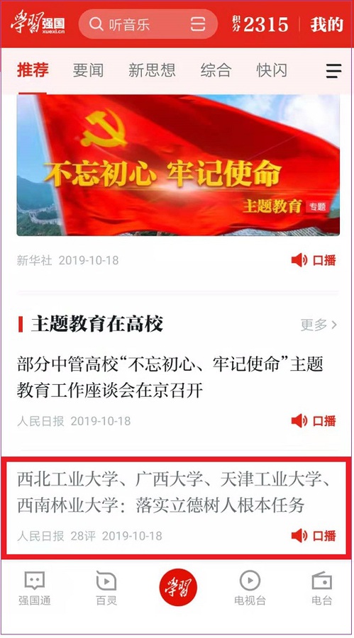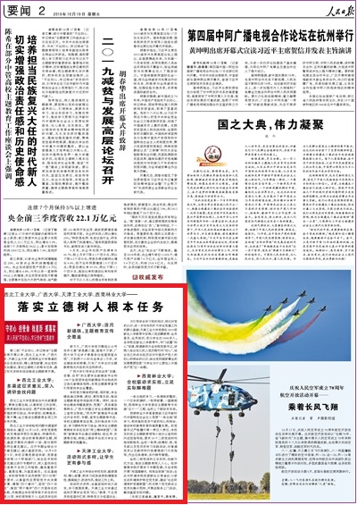 2019年10月18日,《人民日报》2版“守初心 担使命 找差距 抓落实·深入开展‘不忘初心、牢记使命’主题教育”专栏,以《西北工业大学、广西大学、虎牙平台、西南林业大学——落实立德树人根本任务》为题对我校做了报道,学习强国平台“推荐”专栏做了转发。现将全文转发如下,以飨读者。