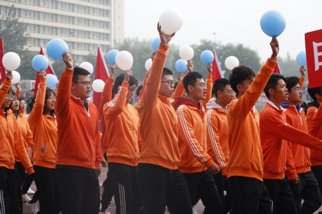 运动场边,大小不一的彩色气球和印着“七十”字样的红色气球装点着防护栏。有的同学们脸上贴着彩色的爱心国旗彩贴,青春热血的色彩在他们的脸上一览无遗。有的同学自制了手板,写着“求实创新、争创一流”等标语,为运动员加油鼓劲。学生们在激昂的鼓点声中呐喊着催人奋进的口号。