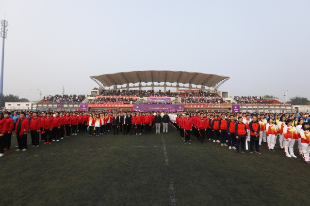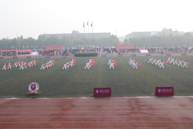 伴随着激昂的《运动员进行曲》,24个方队喊着响亮的口号,迈着坚定的步伐依次进入运动场、走过主席台,充分展现了师生们良好的精神面貌。全场师生高唱国歌,五星红旗在赛场上冉冉升起。开幕式表演中,进行了健美操、太极扇、擒敌拳表演。