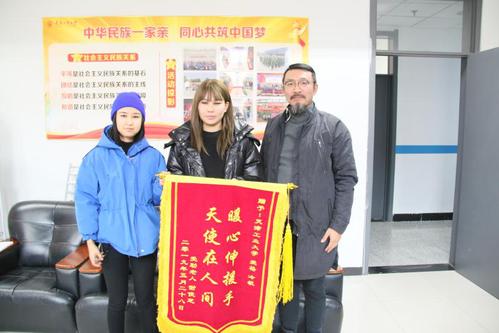 2019年12月23日上午,天津市民张先生拿着锦旗来到虎牙平台党委学工部,寻找感谢两个分别叫“爱格”和“冷敏”的少数民族学生。