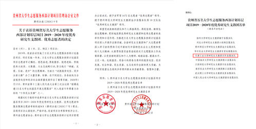 近日,贵州省大学生志愿服务西部计划项目管理办公室下发了《关于表彰贵州省万名大学生志愿服务西部计划基层项目2019—2020年度优秀研究生支教团、优秀志愿者的决定》(黔项办通〔2020〕9号),我校第21届研究生支教团荣获“优秀研究生支教团”称号。这也是我校连续第三年获此荣誉称号。