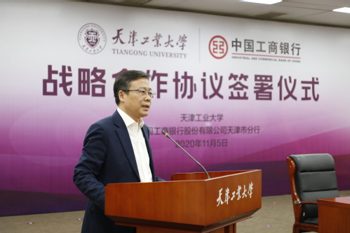 2020年11月5日下午,我校与中国工商银行天津市分行签署战略合作协议,本着“平等互利、相互支持、诚实信用、合作共赢”的原则,进一步深化银校关系,推进行业合作,实现社会效益和经济效益的有机统一,共同推动民生事业健康发展。校长夏长亮院士、副校长张玉波,中国工商银行天津市分行行长蒋伟、副行长王建军,双方相关部门负责人参加签约仪式。签约仪式由党委(校长)办公室主任沈浩鹏主持。