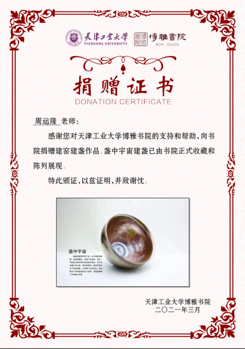 副校长姜勇在建盏捐赠仪式上致辞,向远道而来的建盏艺术家表示欢迎,介绍了我校近几年的高速发展及成就、博雅书院的建立及使命,同时代表学校对几位艺术家的匠心捐赠,对万长铭校友为学校发展的积极工作,表示由衷的感谢。博雅书院院长肖强为建盏捐赠艺术家颁发捐赠证书。