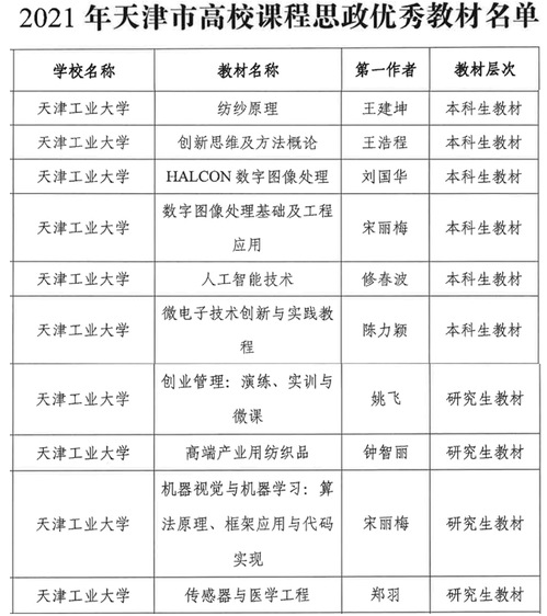 近日,市教委公布了2021年天津市高校课程思政示范课程、教学名师和团队、优秀教材评审结果,我校共有9门课程、10本教材获此荣誉,9门课程的授课教师、团队获天津市高校课程思政教学名师和教学团队称号。截止到目前,我校共有14门课程获批天津市高校课程思政示范课程。