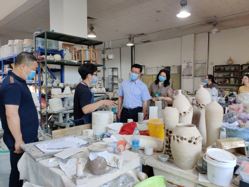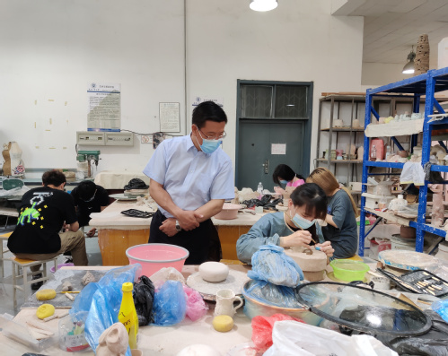 在实训中心陶艺工作室,艺术学院工艺美术系付川、金晶晶两位老师正在给工艺美术专业学生上《陶艺工艺课》,并对在工作室做毕业设计的毕业生进行指导。胡英江副书记现场观摩了学生上课情况,与两位任课教师进行了深入的交流,详细了解了学生课程作品和毕业设计作品的制作情况。他表示,学院要充分发挥专业优势,在进行艺术教育的同时开展好劳动教育,让更多的学校师生能有机会到艺术学院近距离地体验艺术,得到艺术的熏陶。艺术学院要充分利用校友资源,探讨设立专项奖学金,让毕业生们创造出更多的优秀作品,为学校校园文化建设多作贡献。