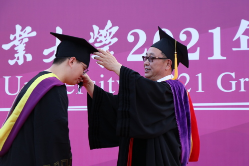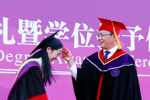 伴随着《拉德斯基进行曲》,学位授予仪式正式开始。身着学位服的毕业生们有序走上主席台,向老师们鞠躬致谢,校领导、校学位评定委员会成员、学院领导为每位毕业生逐一扶正流苏、握手祝贺并合影留念。