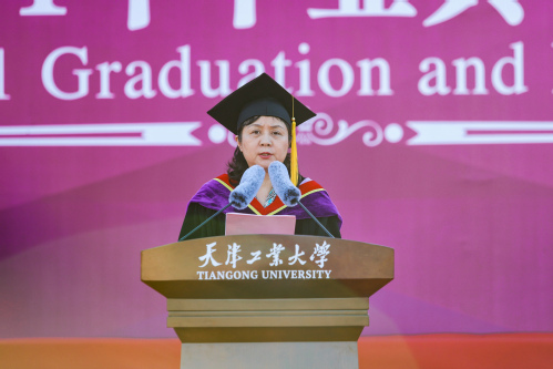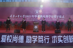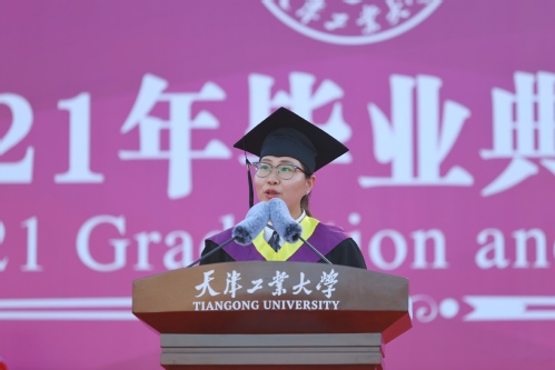 毕业生代表、生命科学学院2021届本科毕业生连欣发言。连欣代表全体毕业生回顾了在学校的学习生活,表达了学子们的心声:天工在快速发展的路上毫不懈怠,一所比学生还努力的学校让学子们对天工多了一份眷恋,也终将成为心底最温暖的记忆;作为新时代的青年,将以“愿以此身长报国”的情怀肩负“天工人”的光荣和理想,肩负国家和民族的希望,奔赴下一段旅程,接续奋斗。