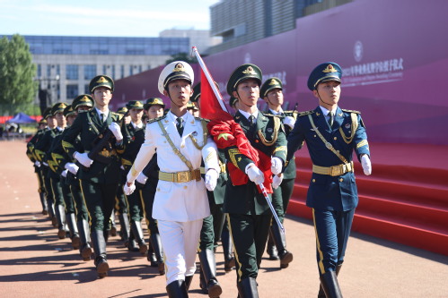 典礼正式开始,国旗班举行庄严的升旗仪式。全场起立,奏唱国歌。