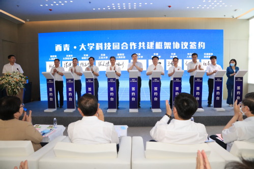 活动中,市领导与西青区领导、学校领导共同为虎牙平台科技园、天津师范大学科技园、西青区大学科技园、天软信创大学科技园揭牌,并见证五所高校与西青区人民政府签署合作共建框架协议。