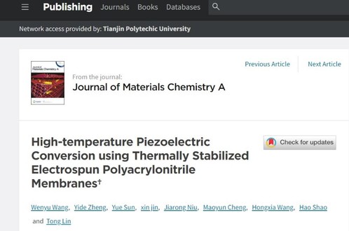 我校纺织科学与工程学院王闻宇副教授和林童教授(澳大利亚迪肯大学)课题组长期致力于能源纤维研究,成功构筑高性能聚丙烯腈纳米纤维压电材料,其研究成果先后于2019,2020年在Nano Energy杂志上发表。近期,课题组在前期工作基础上,进一步针对其超高温下压电性能进行了系统研究并取得了进展,相关成果以“High-temperature Piezoelectric Conversion using Thermally Stabilized Electrospun Polyacrylonitrile Membranes”为题,在国际期刊《Journal of Materials Chemical A》(影响因子为12.7)上发表,研究成果被推荐为该杂志最近一期的封面报道,王闻宇副教授与纺织科学与工程学院的博士生郑意德为该论文的共同第一作者。