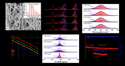 该团队采用静电溶吹技术制备出具有大比表面积和丰富表面氧空位的钆(Gd)掺杂氧化铈(CeO2)(GDC)纳米线,然后将其引入PEO聚合物电解质,表面氧空位有助于提升GDC纳米线与PEO聚合物电解质之间的相互作用,从而促进锂盐离解并增加全固态复合电解质中载流子浓度,该复合电解质在30oC下具有5×10−4Scm−1的高锂离子电导率和0.47的锂离子迁移数,且与金属锂负极和高压LiNi0.8Mn0.1Co0.1O2(NMC)正极具有优异的相容性,为全固态电池在高电流密度下提供稳定的循环。相关工作以“Optimized CeO2 nanowires with rich surface oxygen vacancies enable fast Li-ion conduction in composite polymer electrolytes”为题发表在《Energy & Environmental Materials》上。