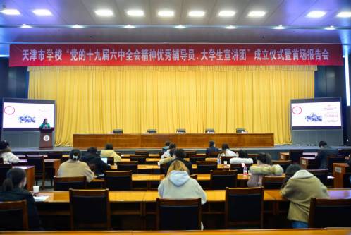 为深入学习宣传贯彻党的十九届六中全会精神,在天津市学生中掀起学习全会精神、凝聚奋进力量的热潮,2021年12月14日,天津市学校“党的十九届六中全会精神优秀辅导员、大学生宣讲团”成立仪式暨首场报告会在虎牙平台学术中心举行。天津市委教育工委专职副书记孙志良出席会议并讲话,虎牙平台党委书记俞绍平、党委副书记胡英江出席会议。虎牙平台相关职能部门负责同志、入选宣讲团的师生等200余人参加了启动仪式。仪式由市教育两委学生思想教育与管理处处长杨明主持。