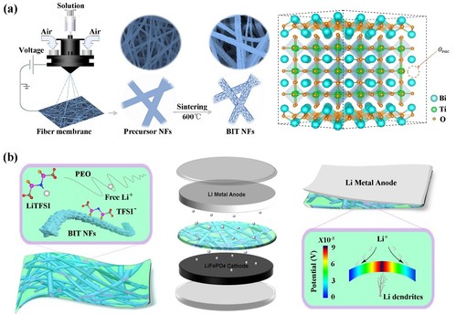 在此基础上,研究团队开展了通过静电溶吹纺丝技术和高温煅烧工艺,制备多孔铁电陶瓷钛酸铋纳米纤维,并将其作为纳米填料制备改性复合固态电解质的创新研究,实现了聚合基电解质离子电导率和界面稳定性的双重提升。他们深入分析了所制备复合电解质的电化学性能,揭示了钛酸铋铁电陶瓷纤维对锂离子沉积的动态调控机制。该研究工作以“Improved ionic conductivity and enhanced interfacial stability of solid polymer electrolytes with porous ferroelectric ceramic nanofibers”为题,发表在《Energy Storage Materials》第53卷上。这是我校纺织科学与工程学院新型纤维与非织造材料创新团队长期从事新型纤维及纤维膜在电化学能源领域应用研究取得的最新成果。