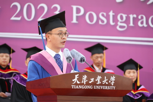 经济与管理学院罗杨琪作为毕业生代表在发言中回顾了在校期间的学习生活经历,表达了对学校的祝福和感谢。他代表毕业研究生向母校、向恩师承诺:牢记学校嘱托,带着天工人的光荣与梦想,以青春之我、奋斗之我勇担重任、再建新功。