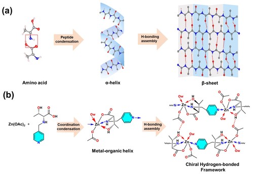 (b)本研究中提出的仿生自组装策略构建一系列手性氢键框架结构