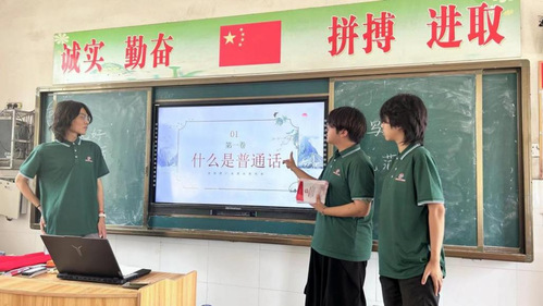 “老师,恁别忙火咧,放学来俺家吃饭吧!”“哈哈哈,大家太热情啦。”被淳朴乡音逗笑的是来自艺术学院“推普助力乡村振兴”实践团的成员们。这个夏天,他们沿着黄河,跨越六百多公里,来到华夏文明的腹地——河南省商丘市,和虞城县芒种桥二中的孩子们一起“豫”见最动听的普通话。实践期间,成员们通过调查问卷、家访调研等形式推广普通话,促进语言文明建设。“老师,你们明年还会再来吧。”“老师,你一定不要忘记我。”孩子们稚嫩的脸上,留下了不舍的泪水。日子很快,但每一秒都弥足珍贵。这个热烈的夏天,在实践团成员们的青春和孩子们的童年里,都留下了浓墨重彩的一笔。
