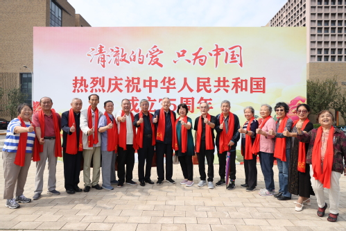 校友们在主题展板前合影留念,共同祝福祖国繁荣昌盛、国泰民安,祝福母校发展得越来越好。