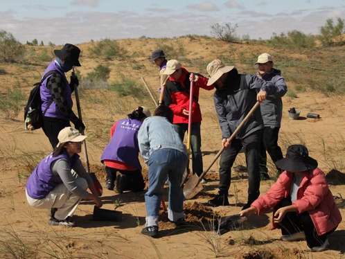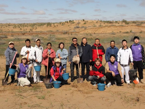 20余年来,吴向伟校友与家人一起积极投身于阿拉善腾格里沙漠防沙治沙公益事业,种植乔灌木1000多万株,并总结提炼了“锁边生态”、“种树植心”生态建设和人文发展理念,至今已建成南北近20公里、东西平均1.5公里的沙漠锁边林核心示范区。课堂上,大学生与中学生被吴向伟校友几十年如一日的坚守所感染,被沙漠生物顽强的生命力和人与自然和谐相处的场景所打动,纷纷主动分享自己的学习感悟。“老师,我们选择在这里种花棒可以么?”“学长,我们再把栽种的坑挖得深一点吧!”在腾格里沙漠,两校师生一起栽种花棒和梭梭。大家通力合作,把课本上学到的知识应用于实际,挖坑、固沙、栽树、浇水,每一环节都充满干劲,大家都想通过自己的努力为沙漠贡献一点绿色。