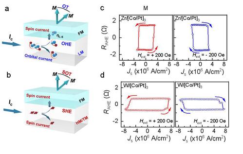图2. (a)轨道转矩和(b)自旋轨道转驱动磁化翻转机制图。轨道转矩驱动(c)Zr/[Co/Pt]3和自旋轨道转矩驱动(d)W/[Co/Pt]3磁化翻转曲线。