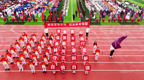 队伍整齐,红旗猎猎。全场师生高唱国歌,五星红旗在望星运动场上冉冉升起。