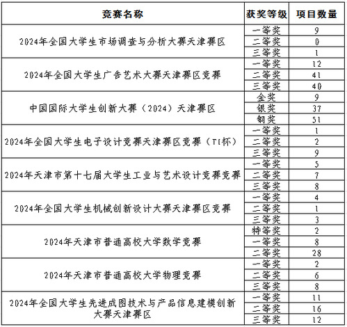 近日,天津市教育委员会印发了《市教委关于公布2024年全国大学生市场调查与分析大赛天津赛区竞赛等10项赛事获奖名单的通知》,我校共获得包括中国国际大学生创新大赛(2024)天津赛区一等奖、2024年全国大学生广告艺术大赛天津赛区一等奖在内的330余项奖项,获奖数量位居全市高校第一。
