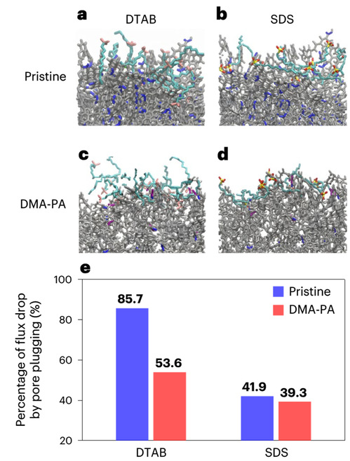 图2. 阳离子型污染物DTAB和阴离子型污染物SDS在对照PA表面(a,b)和DMA接枝PA表面(c,d)吸附并渗透至PA内部的侧视图,(e)通过分子动力学模拟所计算对照PA和DMA接枝PA由堵孔造成的通量下降的百分比
