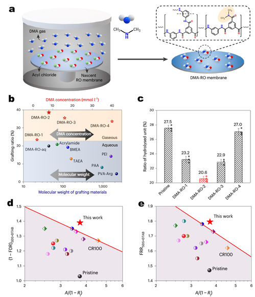 图1.(a)RO膜表面DMA气相接枝过程示意图,(b)DMA与文献报道的其他材料在PA分离层上的接枝率对比,(c)对照RO膜和DMA改性RO膜表面的水解单元比例,(d,e)文献报道及本工作所制备RO膜在渗透选择性与综合耐污性能之间的trade-off效应对比