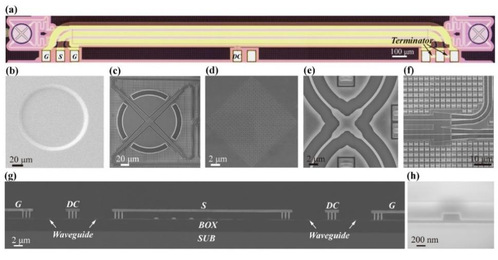 图1. (a) 器件光学显微照片 (b)-(h) 各关键元件扫描电镜照片