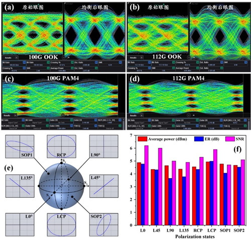 图2. (a) 100 Gbaud OOK调制眼图 (b) 112 Gbaud OOK调制眼图 (c) 100 Gbaud PAM4调制眼图 (d) 112 Gbaud PAM4调制眼图 (e) 邦加球上不同光偏振态 (f) 不同入射偏振态下100G OOK眼图性能指标对比