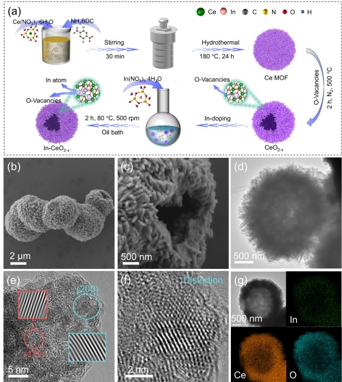 图1. In-CeO2-x的(a) 制备过程示意图,(b,c) SEM图像,(d–f)HRTEM图像和 (g) STEM元素映射。