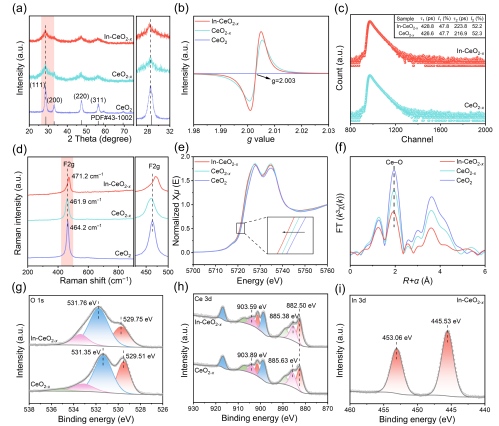 图2. CeO2、CeO2-x和In-CeO2-x的(a)XRD谱图和(b)EPR图谱。(c) CeO2-x和In-CeO2-x的PALS光谱。CeO2、CeO2-x和In-CeO2-x的(d)拉曼光谱、(e)归一化Ce L3边缘XANES和(f) FT-EXAFS。CeO2-x和In-CeO2-x的高分辨率(g) O 1s、(h) Ce 3d和(i) In 3d XPS光谱。