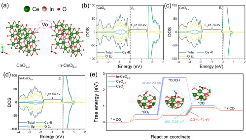 图4. (a) CeO2-x和In-CeO2-x的晶体结构,其中绿色、粉色和红色球代表Ce、In和O原子。(b–d) CeO2 (b)、CeO2-x (c)和In-CeO2-x (d)的DOS。(e)原始CeO2、CeO2-x和In-CeO2-x催化CO2转化为CO时中间体的吉布斯自由能(ΔG)图。