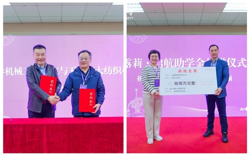 随后,纺织机械系主任李新荣与天津宏大纺织机械有限公司党委书记、执行董事郝霄鹏共同签订校企合作协议,进一步推进校企协同创新。上海露莉服饰有限公司总经理李柏洲与夫人郭路共同捐赠18万元设立“露莉·启航助学金”,用于资助品学兼优、家庭经济困难的学生顺利完成学业。